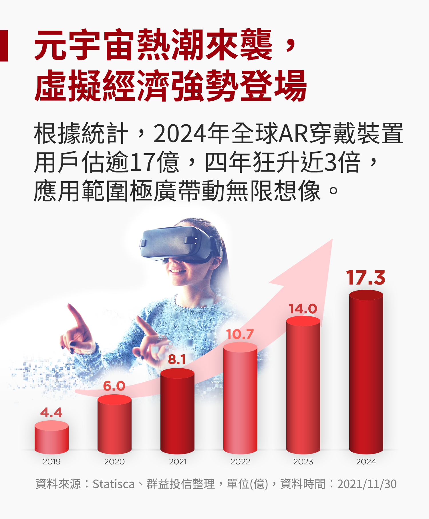 由於相關的應用與想像空間無遠弗屆,NVidia輝達的執行長黃仁勳更說:「元宇宙的經濟規模,終將大過實體世界。」元宇宙仍在萌芽階段,建議投資人可透過美國科技巨頭切入,掌握未來虛擬世界的經濟脈絡。