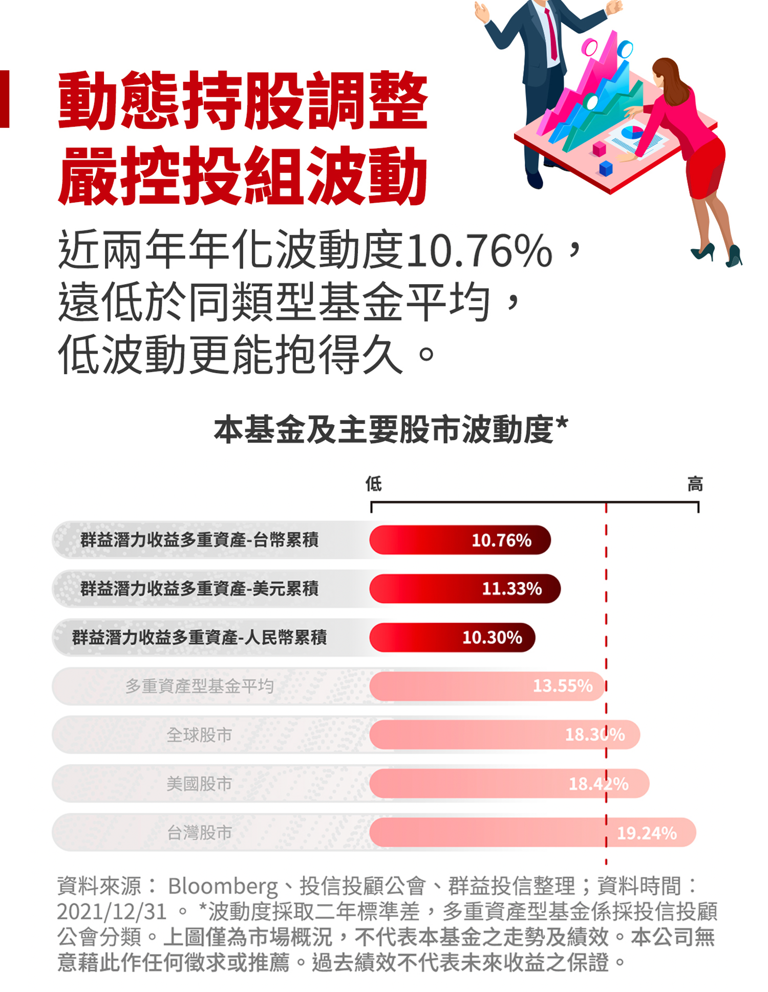 投資標的琳瑯滿目,要怎麼挑到具有潛力成長行情,又可以穩定配息的金融商品,群益潛力收益多重資產基金就是為了此投資需求而生的產品。其以多重資產配置策略分散風險,挑選美國各領域最具前景的企業,在科技、消費板塊都進行重點布局;搭配具有固定收益性質的高收益債、特別股,加強領息能力,讓投資人可以兼顧爆發力跟穩定現金流。