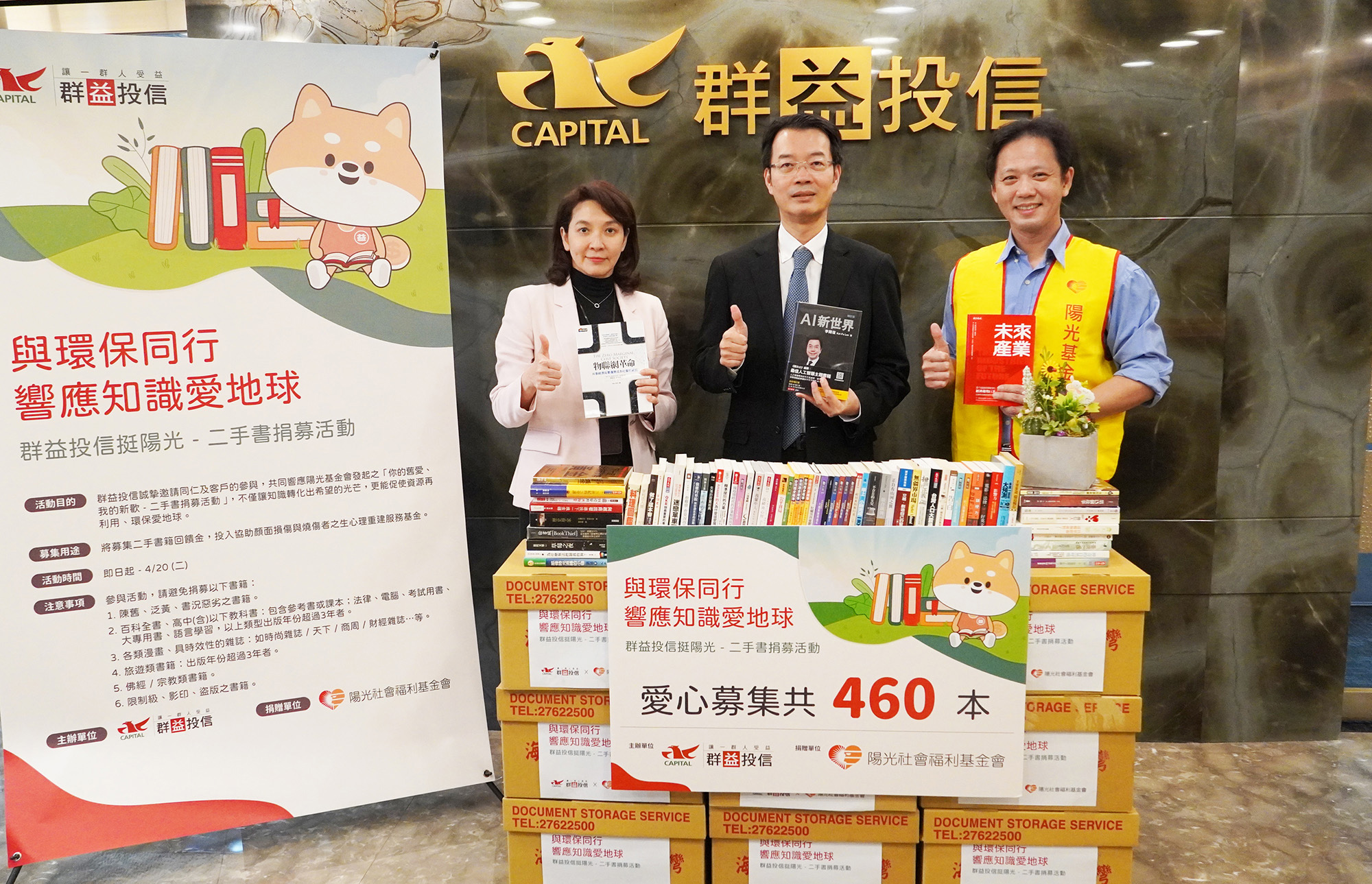 群益投信舉辦「響應知識環保愛地球,二手書捐募挺陽光」活動,積極整合企業資源並鼓勵員工一同響應,以行動力實踐企業理念,善盡地球公民責任。透過募捐二手書,促進減碳和資源再利用,也讓知識的力量持續流傳。針對本次活動,群益投信總經理陳明輝表示:「二手書是傳遞知識力,集合眾人之力做公益,產生極大的正向力,群益投信帶領員工及大眾一同投入社會公益,正好讓這兩股力量得以完美結合,達到知識與環境雙重永續。」,本次共募集205本愛心書籍捐贈,傳愛幫助燒燙傷病友。