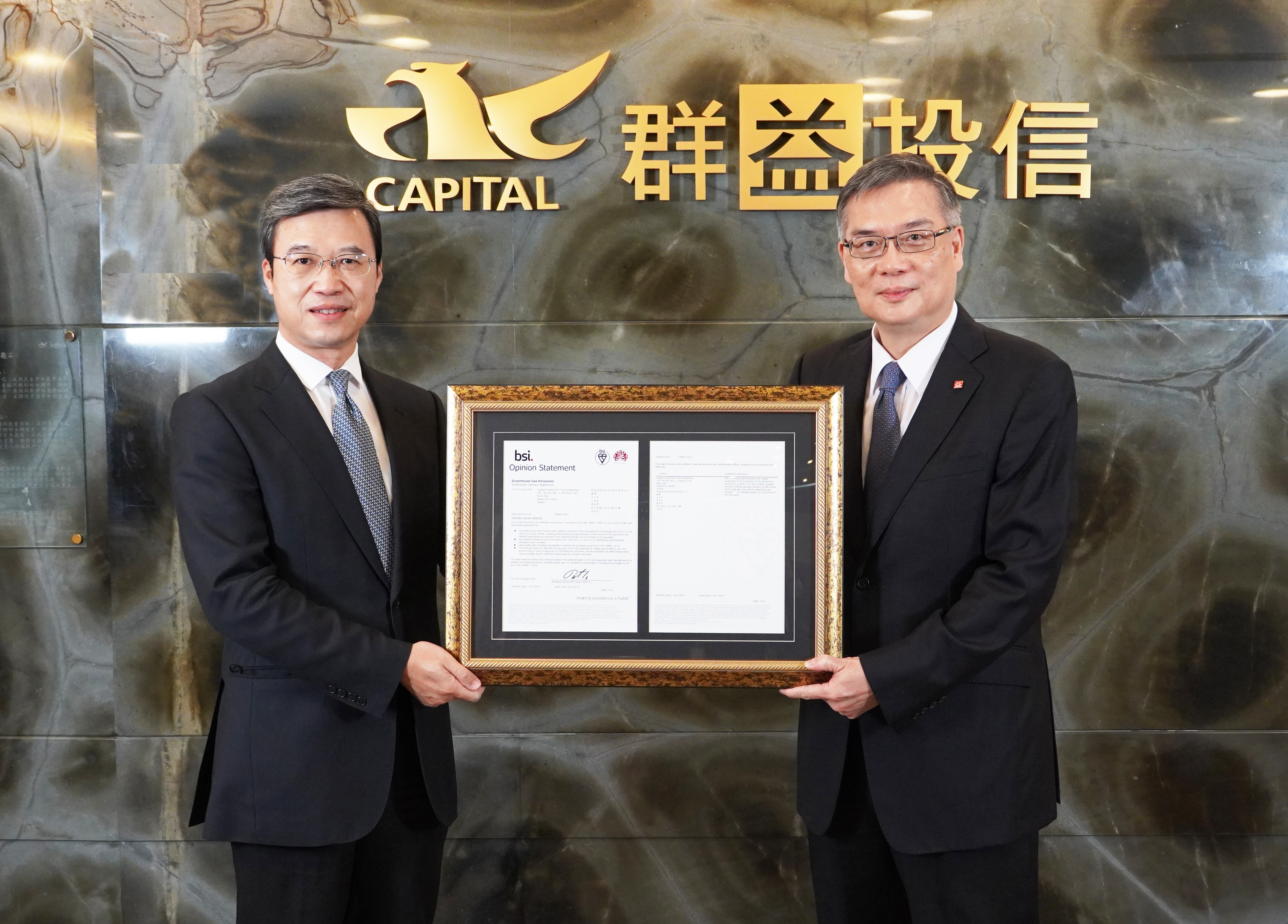◆BSI東北亞區總經理蒲樹盛(左)頒發ISO14064-1驗證證書予群益投信董事長賴政昇(右)
