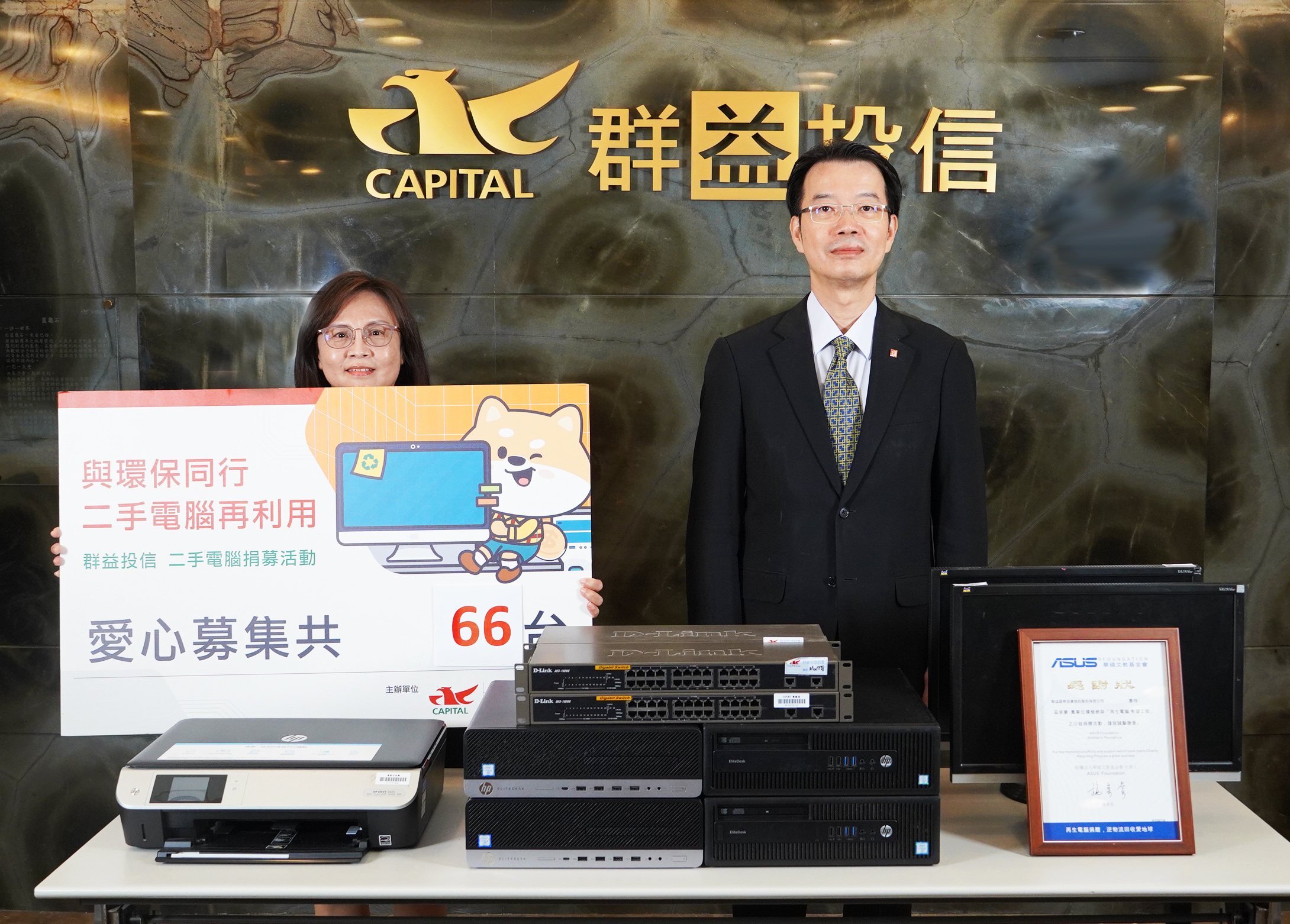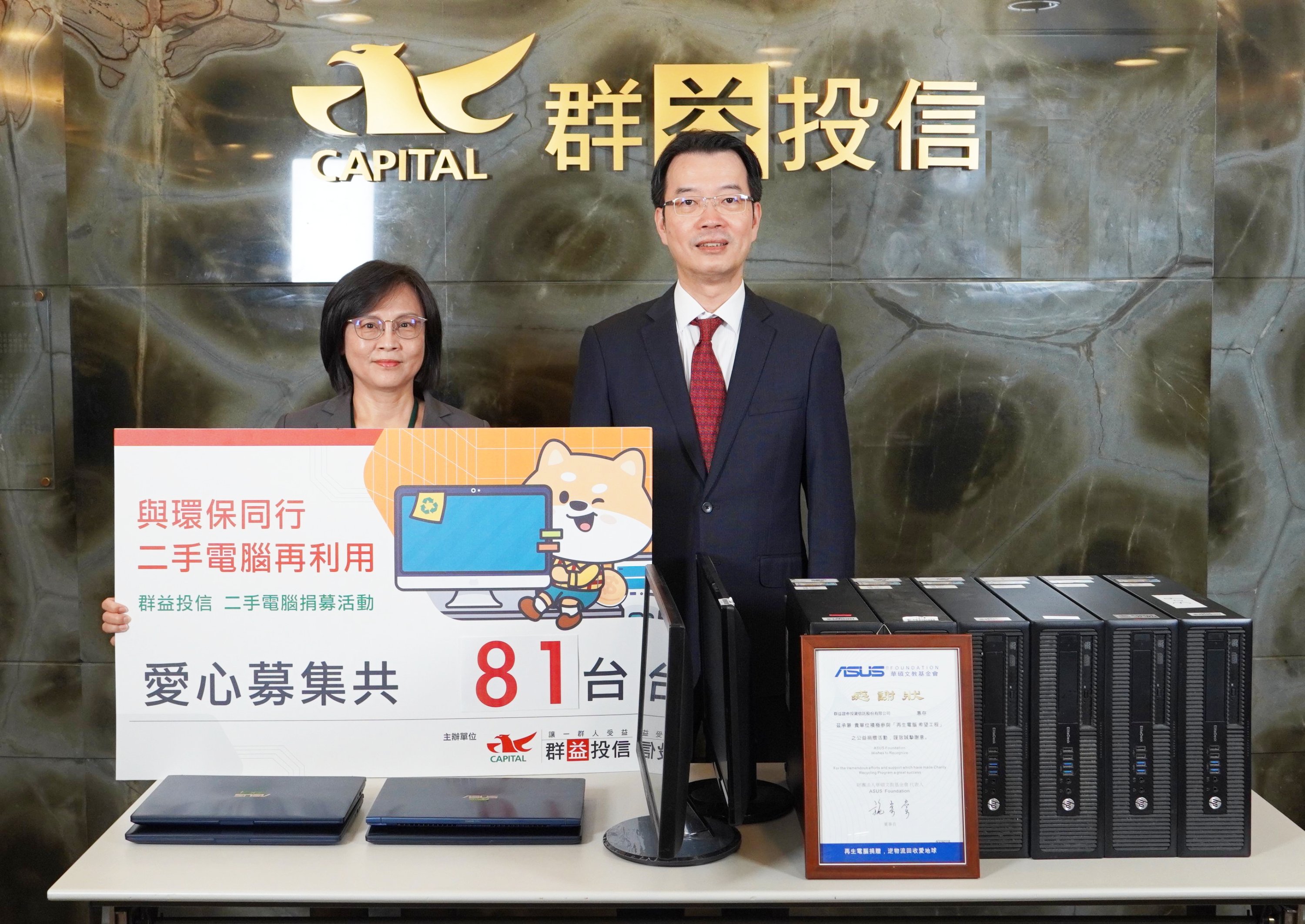 今年群益投信再度響應參加由華碩文教基金會發起的逆物流回收再生電腦捐贈愛地球專案,共捐贈66台二手電腦,減少資訊廢棄物的環境汙染,這次電腦捐贈統計可減少近2.4萬噸的二氧化碳排放量,形同拯救近200棵樹木,經過重新組裝後的再生電腦將捐贈公益組織使用,既促進資源循環再利用,也能進一步協助弱勢族群縮短數位落差,達到環保、經濟、公益三贏。