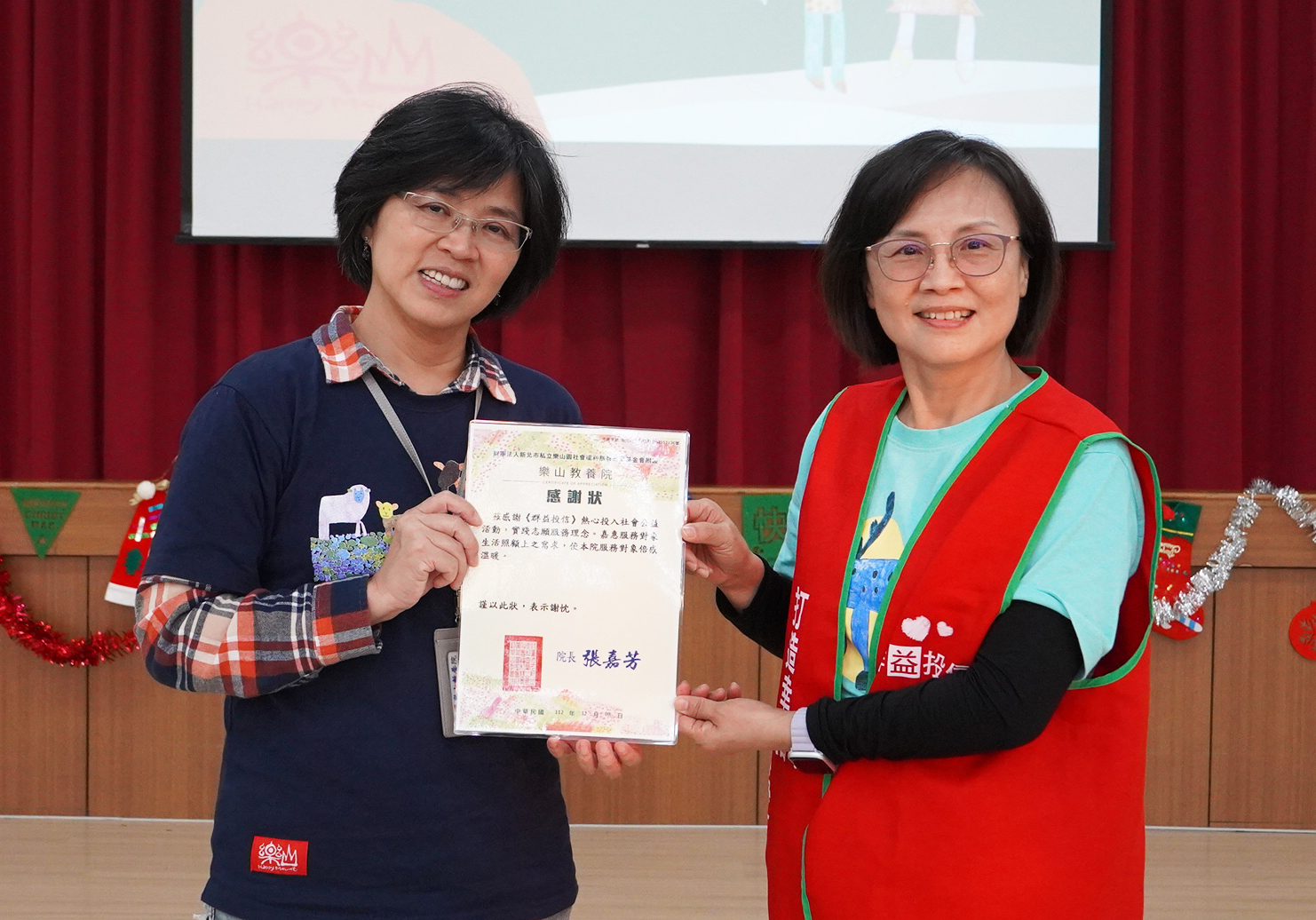 ■樂山教養院頒感謝狀-蘇瑩娟副總經理(右)、樂山教養院張嘉芳院長(左)