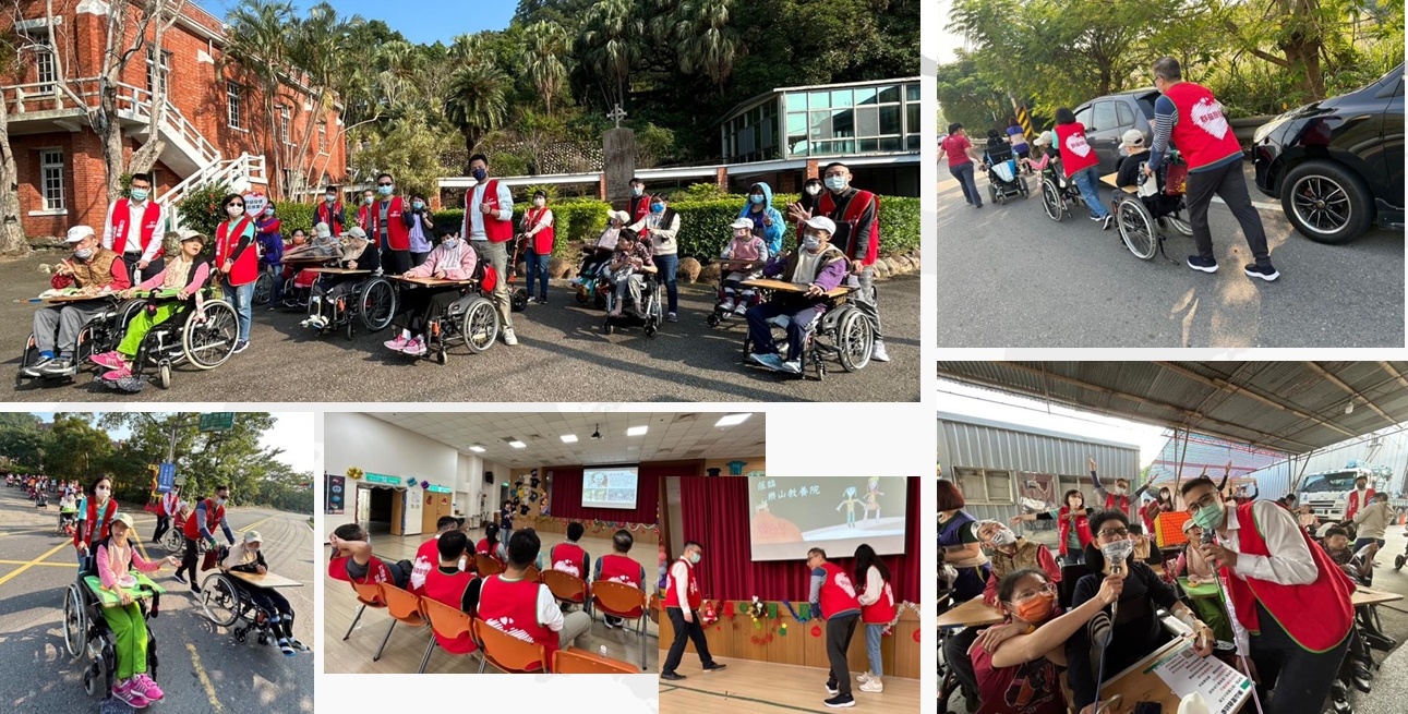 2023年末,群益志工團再度至樂山教養院服務,本次的任務是陪伴院生到院外的土地公廟歡唱卡拉OK,因為愛護班的院生需靠輪椅行動,志工們協助推動輪椅陪伴院生外出,院生心情都非常開心,歡唱午後時光。因適逢耶誕節將近,志工們回到樂山後協助佈置、打掃大禮堂的耶誕裝飾,讓院生在耶誕晚會,能夠有一個難忘的夜晚。