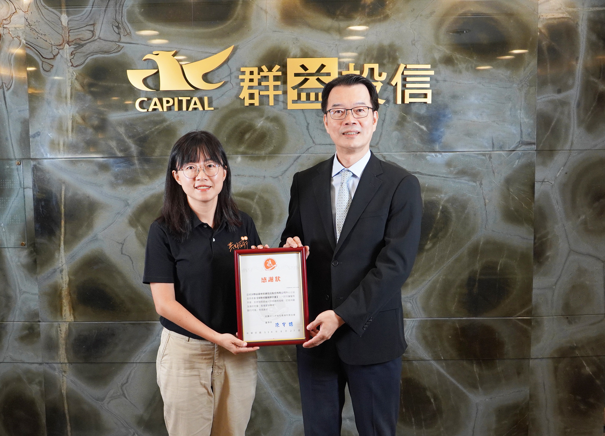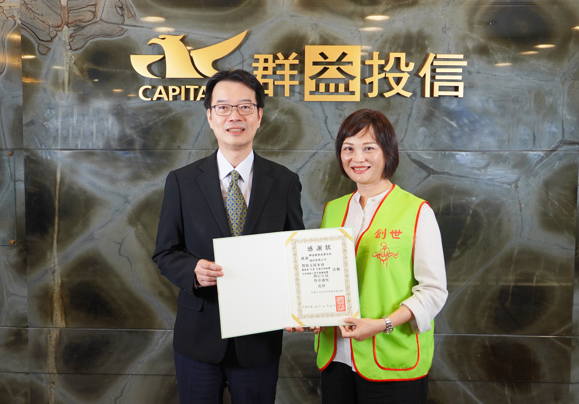 ■群益投信總經理陳明輝(左)代表接受創世基金會副秘書長李秀娟(右)致贈之感謝狀