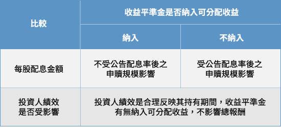 - 穩定ETF配息率,合理公平對待追求穩定配息之長期投資人:將收益平準金納入可分配範圍,經理公司之配息政策較不易受短期基金申贖干擾,可避免追求穩定現金流的投資人,被後期加入的新投資人瓜分配息,造成配息金額及配息率不穩定,可合理公平對待追求穩定配息之長期投資人。尤其對於規模小之ETF,穩定ETF配息率之效果更為顯著。