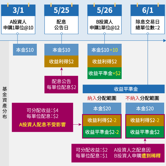 都是一樣的。因新申購投資人申購時所支付的價金亦已包含該收益,原有投資人之權益亦未受到影響。但預計分配之配息因為參與配息的股份變多,所能分配的每股配息會被稀釋。