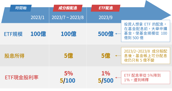 - 以下圖為例,若ETF於今年8月底前均維持100億的規模,期間領到的股利所得為5億,則9月配息時原本可配發的現金股息率為5%(=5億/100億)。然而,若9月除息前有大筆申購資金,將ETF規模擴大至500億,但此時帳上仍只有5億的股利所得,因此ETF現金股息率將從5%稀釋到1%(=5億/500億)。