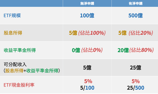 - 在收益平準金機制下,若ETF除息前沒有淨申購,規模維持在100億,則配發的5億現金股利將100%來自於股息所得。若ETF有淨申購使得規模增加到500億,配發的25億現金股利將有20%來自於股息所得、80%來自於收益平準金。