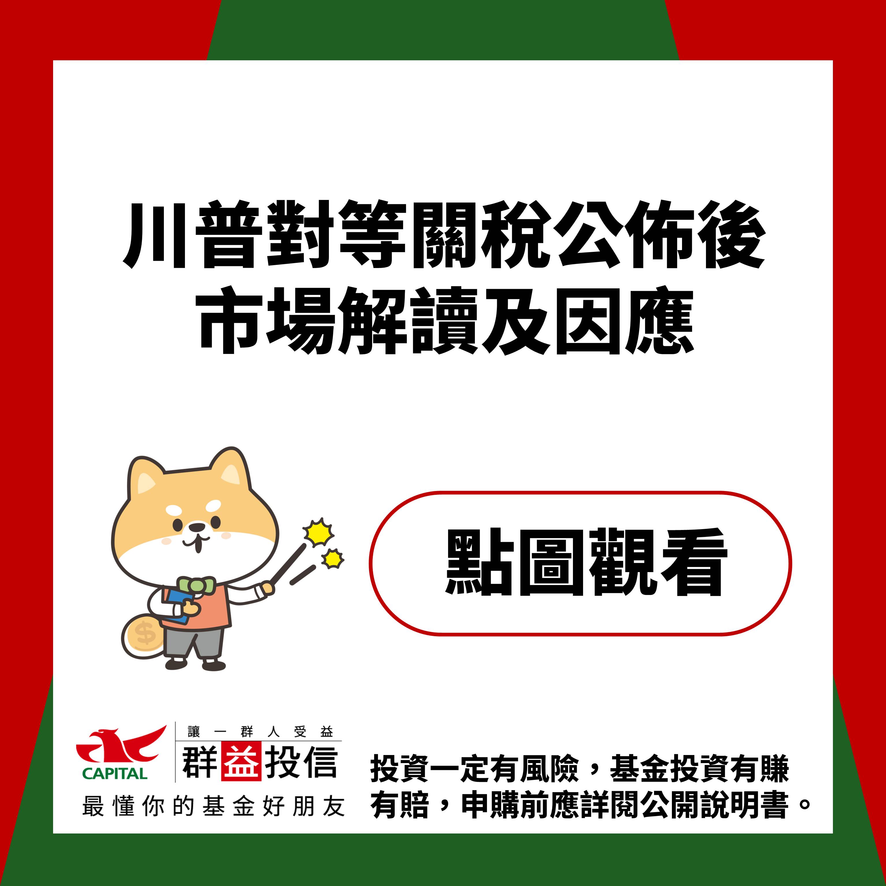 群益投信獨立經營管理。本網站提供之資料僅供參考。本網站所提供之資訊乃基於或來自於相信為可靠之消息來源。經理公司並不保證其完整性。該等資訊將根據市場情況而隨時更改。經理公司並不對任何人因使用任何本網站提供之資訊所引起之損失而負責。系列基金經金管會或其指定機構核准或同意生效,惟不表示系列基金絕無風險。經理公司以往之經理績效不保證系列基金之最低投資收益;經理公司除盡善良管理人之注意義務外,不負責系列基金之盈虧,亦不保證最低之收益。投資一定有風險,基金投資有賺有賠,申購前應詳閱公開說明書或簡式公開說明書。系列基金並無受存款保險、保險安定基金或其他相關保障機制之保障,基金投資可能發生部分或全部本金之損失,投資人須自負盈虧。有關基金應負擔之費用已揭露於公開說明書或簡式公開說明書中,投資人可向經理公司及基金銷售機構索取,或至公開資訊觀測站(mops.twse.com.tw)及經理公司網站(www.capitalfund.com.tw)中查詢。投資遞延手續費N類型者,其手續費之收取將於買回時支付,且該費用將依持有期間而有所不同,其餘費用之計收與前收手續費類型完全相同,亦不加計分銷費用。本網站提及之相關資產配置比重僅供示意,不代表系列基金之必然投資配置,系列基金之實際配置,經理公司將依實際市場狀況進行調整。投資人申購系列基金係持有基金受益憑證,而非本網站提及之投資資產或標的。本網站提及之經濟走勢預測不必然代表系列基金之績效,此外匯率走勢亦可能影響所投資之海外資產價值變動,系列基金投資風險請詳閱基金公開說明書。本網站涉及新興市場部分,因其波動性與風險程度可能較高,且其政治經濟情勢穩定度可能使資產價值受不同程度之影響。基金配息不代表基金實際報酬,且過去配息不代表未來配息;基金淨值可能因市場因素而上下波動。系列基金淨值/配息組成項目,可於經理公司網站查詢。系列基金配息可能由基金的收益或本金/收益平準金中支付。任何涉及由本金/收益平準金支出的部份,可能導致原始投資金額減少。投資人因不同時間進場,將有不同之投資績效,過去之績效亦不代表未來績效之保證。本網站如涉及系列被動式ETF追蹤指數績效或殖利率之表現,不代表系列被動式ETF之實際報酬率或配息率及未來績效保證,不同時間進場投資,其結果將可能不同,且並未考量交易成本。系列主動式ETF投資目標未追蹤、模擬或複製特定指數之表現,而係經理公司依其所訂投資策略進行投資。查詢系列基金公開說明書或簡式公開說明書之網址,包括金管會指定之資訊申報網站之網址及經理公司揭露公開說明書相關資料之網址。1.「群益投信理財網」(www.capitalfund.com.tw)2.「公開資訊觀測站」(mops.twse.com.tw)。