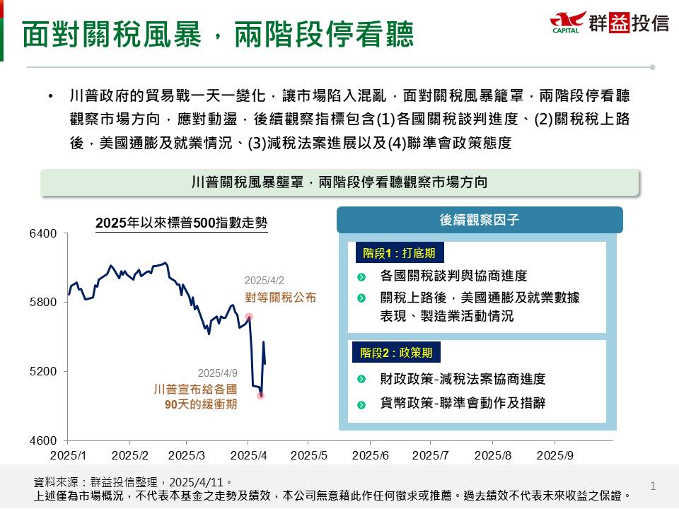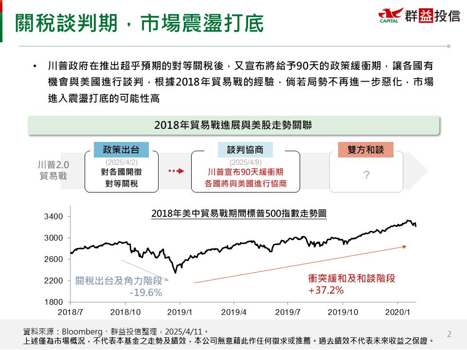 川普政府在推出超乎預期的對等關稅後,又宣布將給予90天的政策緩衝期,讓各國有機會與美國進行談判,根據2018年貿易戰的經驗,倘若局勢不再進一步惡化,市場進入震盪打底的可能性高。