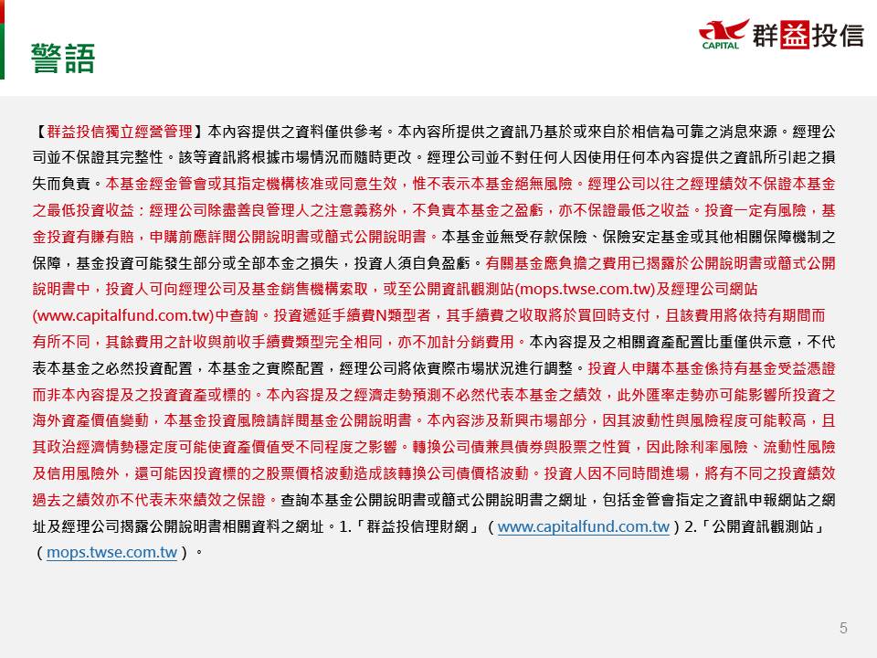 群益投信獨立經營管理。本網站提供之資料僅供參考。本網站所提供之資訊乃基於或來自於相信為可靠之消息來源。經理公司並不保證其完整性。該等資訊將根據市場情況而隨時更改。經理公司並不對任何人因使用任何本網站提供之資訊所引起之損失而負責。系列基金經金管會或其指定機構核准或同意生效,惟不表示系列基金絕無風險。經理公司以往之經理績效不保證系列基金之最低投資收益;經理公司除盡善良管理人之注意義務外,不負責系列基金之盈虧,亦不保證最低之收益。投資一定有風險,基金投資有賺有賠,申購前應詳閱公開說明書或簡式公開說明書。系列基金並無受存款保險、保險安定基金或其他相關保障機制之保障,基金投資可能發生部分或全部本金之損失,投資人須自負盈虧。有關基金應負擔之費用已揭露於公開說明書或簡式公開說明書中,投資人可向經理公司及基金銷售機構索取,或至公開資訊觀測站(mops.twse.com.tw)及經理公司網站(www.capitalfund.com.tw)中查詢。投資遞延手續費N類型者,其手續費之收取將於買回時支付,且該費用將依持有期間而有所不同,其餘費用之計收與前收手續費類型完全相同,亦不加計分銷費用。本網站提及之相關資產配置比重僅供示意,不代表系列基金之必然投資配置,系列基金之實際配置,經理公司將依實際市場狀況進行調整。投資人申購系列基金係持有基金受益憑證,而非本網站提及之投資資產或標的。本網站提及之經濟走勢預測不必然代表系列基金之績效,此外匯率走勢亦可能影響所投資之海外資產價值變動,系列基金投資風險請詳閱基金公開說明書。本網站涉及新興市場部分,因其波動性與風險程度可能較高,且其政治經濟情勢穩定度可能使資產價值受不同程度之影響。基金配息不代表基金實際報酬,且過去配息不代表未來配息;基金淨值可能因市場因素而上下波動。系列基金淨值/配息組成項目,可於經理公司網站查詢。系列基金配息可能由基金的收益或本金/收益平準金中支付。任何涉及由本金/收益平準金支出的部份,可能導致原始投資金額減少。投資人因不同時間進場,將有不同之投資績效,過去之績效亦不代表未來績效之保證。本網站如涉及系列被動式ETF追蹤指數績效或殖利率之表現,不代表系列被動式ETF之實際報酬率或配息率及未來績效保證,不同時間進場投資,其結果將可能不同,且並未考量交易成本。系列主動式ETF投資目標未追蹤、模擬或複製特定指數之表現,而係經理公司依其所訂投資策略進行投資。查詢系列基金公開說明書或簡式公開說明書之網址,包括金管會指定之資訊申報網站之網址及經理公司揭露公開說明書相關資料之網址。1.「群益投信理財網」(www.capitalfund.com.tw)2.「公開資訊觀測站」(mops.twse.com.tw)。
