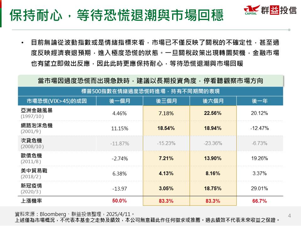 目前無論從波動指數或情緒指標來看,市場已不僅反映了關稅的不確定性,甚至過度反映經濟衰退預期,進入極度恐慌的狀態,一旦關稅政策出現轉圜契機,金融市場也有望立即做出反應,因此此時更應保持耐心,等待恐慌退潮與市場回暖。