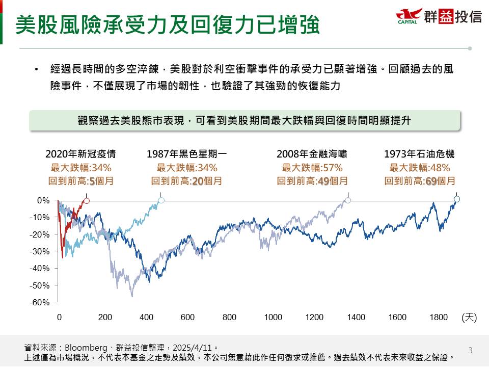 經過長時間的多空淬鍊,美股對於利空衝擊事件的承受力已顯著增強。回顧過去的風險事件,不僅展現了市場的韌性,也驗證了其強勁的恢復能力。