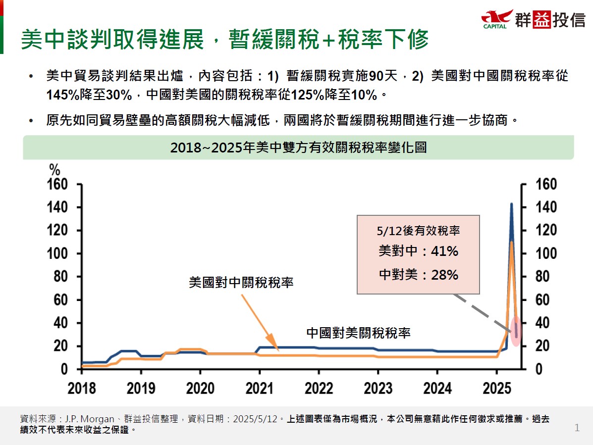 5/12於日內瓦進行的美中貿易談判結果出爐,內容包括:1) 暫緩關稅實施90天,2) 美國對中國商品關稅稅率從145%降至30%,中國對美國的報復性關稅從125%降至10%。此次談判結果使原先形同禁運的不合理水準大幅修正,後續兩國也將就芬太尼等議題進行進一步協商。