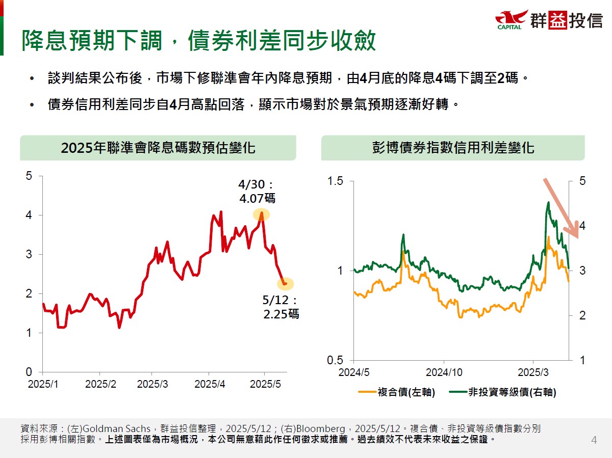 本次談判後,市場同步下修聯準會年內降息預期,由4月底的預期降息4碼減少至降息2碼,信用債利差也由4月的高點回落,顯示投資人對於景氣預期逐漸轉好。