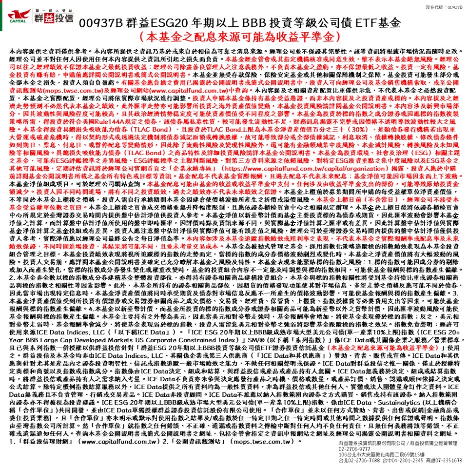 群益投信獨立經營管理。本網站提供之資料僅供參考。本網站所提供之資訊乃基於或來自於相信為可靠之消息來源。經理公司並不保證其完整性。該等資訊將根據市場情況而隨時更改。經理公司並不對任何人因使用任何本網站提供之資訊所引起之損失而負責。系列基金經金管會或其指定機構核准或同意生效,惟不表示系列基金絕無風險。經理公司以往之經理績效不保證系列基金之最低投資收益;經理公司除盡善良管理人之注意義務外,不負責系列基金之盈虧,亦不保證最低之收益。投資一定有風險,基金投資有賺有賠,申購前應詳閱公開說明書或簡式公開說明書。系列基金並無受存款保險、保險安定基金或其他相關保障機制之保障,基金投資可能發生部分或全部本金之損失,投資人須自負盈虧。有關基金應負擔之費用已揭露於公開說明書或簡式公開說明書中,投資人可向經理公司及基金銷售機構索取,或至公開資訊觀測站(mops.twse.com.tw)及經理公司網站(www.capitalfund.com.tw)中查詢。投資遞延手續費N類型者,其手續費之收取將於買回時支付,且該費用將依持有期間而有所不同,其餘費用之計收與前收手續費類型完全相同,亦不加計分銷費用。本網站提及之相關資產配置比重僅供示意,不代表系列基金之必然投資配置,系列基金之實際配置,經理公司將依實際市場狀況進行調整。投資人申購系列基金係持有基金受益憑證,而非本網站提及之投資資產或標的。本網站提及之經濟走勢預測不必然代表系列基金之績效,此外匯率走勢亦可能影響所投資之海外資產價值變動,系列基金投資風險請詳閱基金公開說明書。本網站涉及新興市場部分,因其波動性與風險程度可能較高,且其政治經濟情勢穩定度可能使資產價值受不同程度之影響。基金配息不代表基金實際報酬,且過去配息不代表未來配息;基金淨值可能因市場因素而上下波動。系列基金淨值/配息組成項目,可於經理公司網站查詢。系列基金配息可能由基金的收益或本金/收益平準金中支付。任何涉及由本金/收益平準金支出的部份,可能導致原始投資金額減少。投資人因不同時間進場,將有不同之投資績效,過去之績效亦不代表未來績效之保證。本網站如涉及系列被動式ETF追蹤指數績效或殖利率之表現,不代表系列被動式ETF之實際報酬率或配息率及未來績效保證,不同時間進場投資,其結果將可能不同,且並未考量交易成本。系列主動式ETF投資目標未追蹤、模擬或複製特定指數之表現,而係經理公司依其所訂投資策略進行投資。查詢系列基金公開說明書或簡式公開說明書之網址,包括金管會指定之資訊申報網站之網址及經理公司揭露公開說明書相關資料之網址。1.「群益投信理財網」(www.capitalfund.com.tw)2.「公開資訊觀測站」(mops.twse.com.tw)。