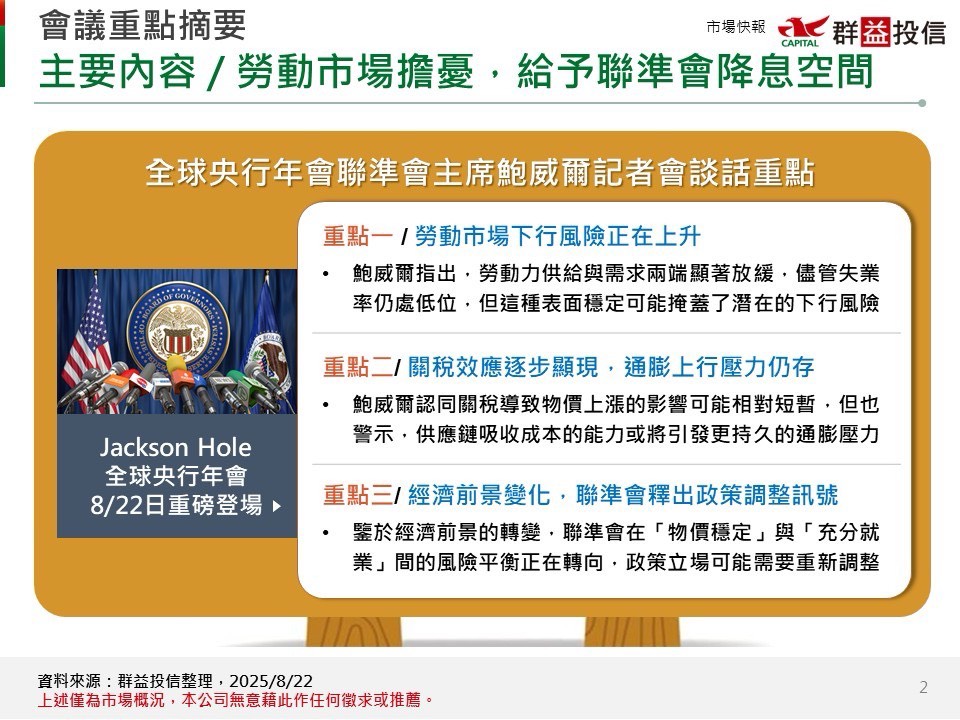 就業市場風險正上升 / 鮑威爾指出,勞動力供給與需求兩端顯著放緩,儘管失業率仍處低位,但這種表面穩定可能掩蓋了潛在的下行風險
