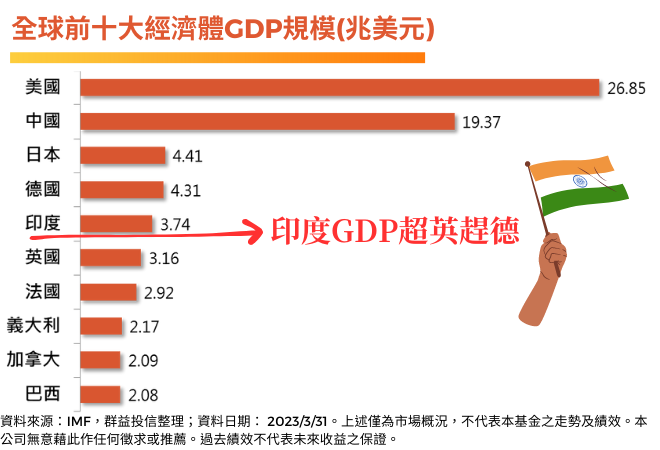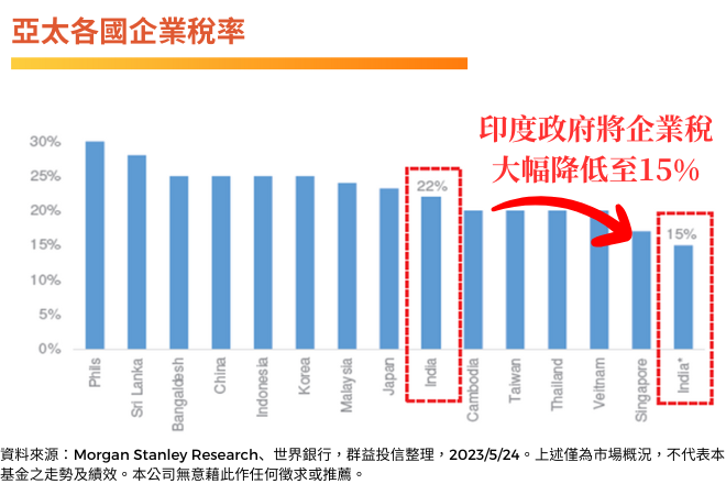 政策上,印度政府全力衝刺,將企業稅率調降到亞太區最低的15%,目的就是盡可能吸引國際資金進駐,讓Made in India躍上國際檯面;預算上,印度政府也不手軟,宣布2023年度資本支出規模超過4,200億美元,是前一年的兩倍之多,預期為印度經濟注入一發強心針。