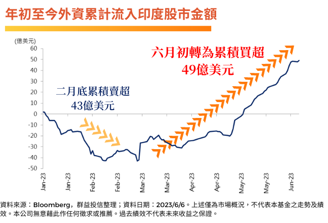 不斷創新高的印度股市也重拾外資的青睞,自今年二月以來外資已轉賣為買,五月的買超金額更創下近期的單月新高,年初至今已累積淨買超49億美元,證實了外資看好印度紮實的基本面能在未來一一兌現。