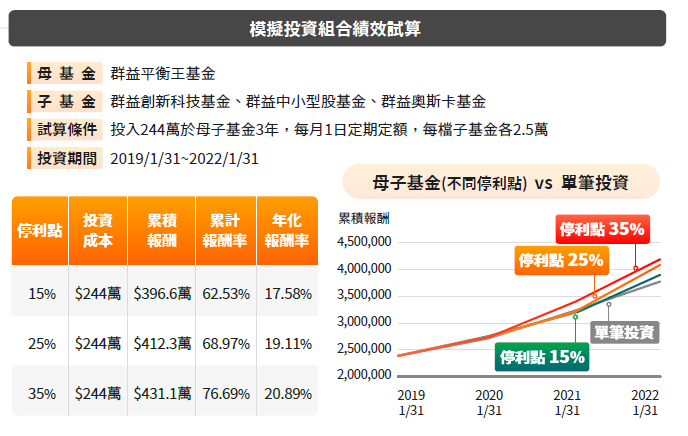 例如,若原本僅將資金停泊於貨幣市場基金,近3年的年化報酬率為0.38%,但若加上母子基金的機制,以母子基金方式定期定額於波動較大的創新科技基金,年化報酬率則提升至7.25%