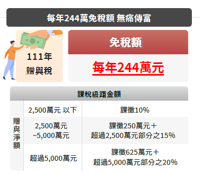 您知道嗎?2022年贈與稅的免稅額已調高至244萬。根據「遺產及贈與稅法」規定,贈與稅的納稅義務人是「贈與人」,贈與稅稅率為10%至20%,但每人每年有244萬元贈與免稅額,且配偶相互贈與以及父母於子女婚嫁贈與財物100萬元以內免稅。