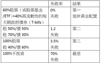 西班牙研究假設平均62歲才退休,假設退休後有30年要過,引用退休4%法則,第一年開始提領退休金的4%來用,之後再按物價上漲率每年提高一點提領率以維持生活品質,各種股債配置比例的失敗率。根據研究顯示,不論配置多少,失敗率都在3.5%以下,但完全不投資失敗率達70%。