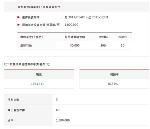 以群益母子基金為例,選擇較保守的組合: 收益組合基金當母基金100萬,子基金選創新科技基金每月轉申購3萬,經過五年,可得36.34%的報酬,達成每年超越4%的報酬目標,退休族能輕鬆享受愜意的第二人生,又不須擔心退休金放現金被通膨侵蝕的難題。
