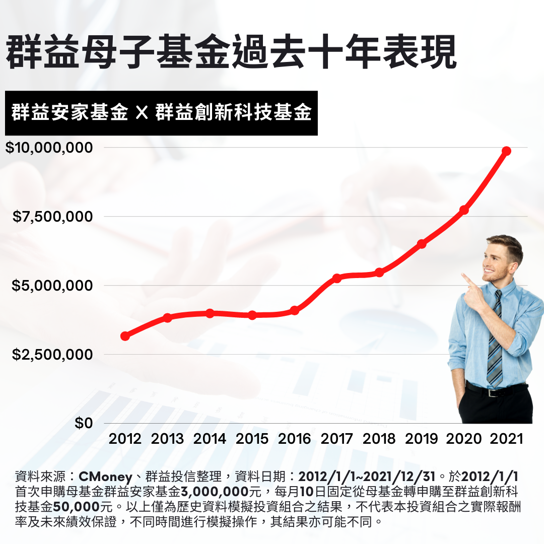 而近期台股已回檔到甜蜜點,此時進場勝率更高。如圖表所示,以300萬台幣做為台股資金池,先投入群益安家基金(母基金-平衡型基金),抵禦市場波動,起到跟漲抗跌的守護資產作用;並且每月自動扣款至群益創新科技基金(子基金-股票型基金),定期定額投入到爆發力強的標的,賺取超額報酬。