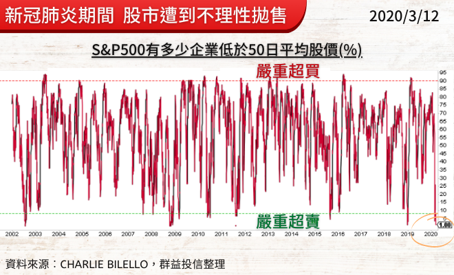 知名投資機構Compound Capital Advisors的CEO - Charlie Bilello用歷史統計數據幫你找出答案︰2020年3月新冠肺炎,投資人極度恐慌的情緒主導著市場的資金流向,信心崩盤導致股市被嚴重超賣,當時僅有1%的S&P500企業在50日平均股價之上。