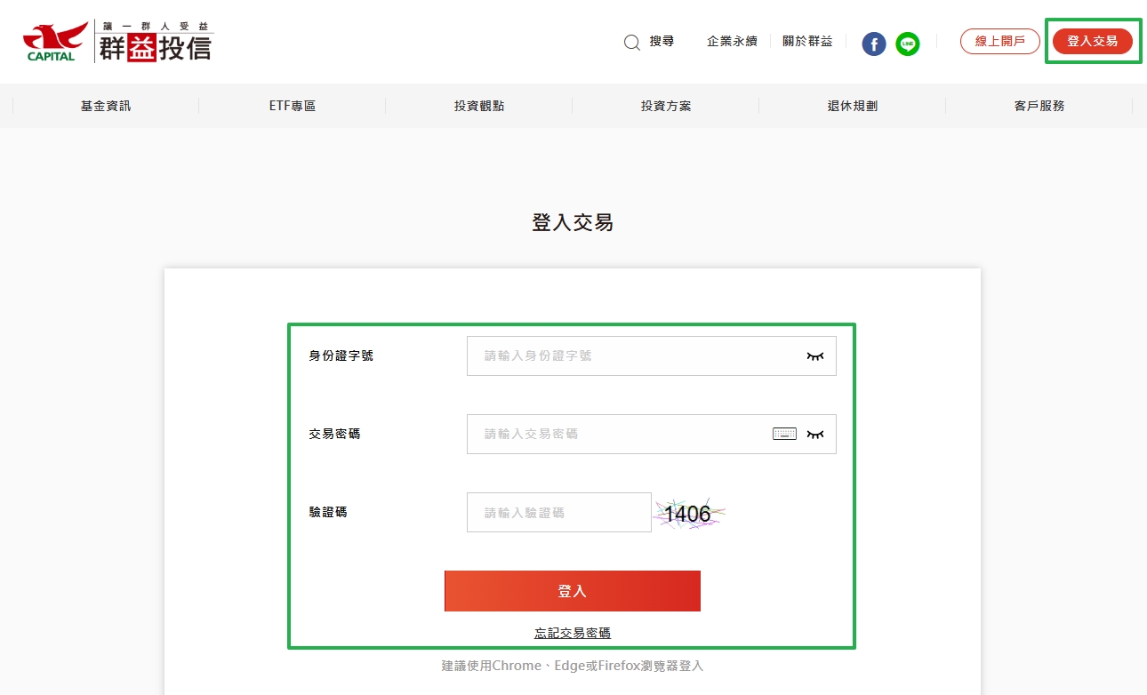 到群益投信官網後,點擊右上角"登入交易"按鈕,填寫相關資訊後登入系統