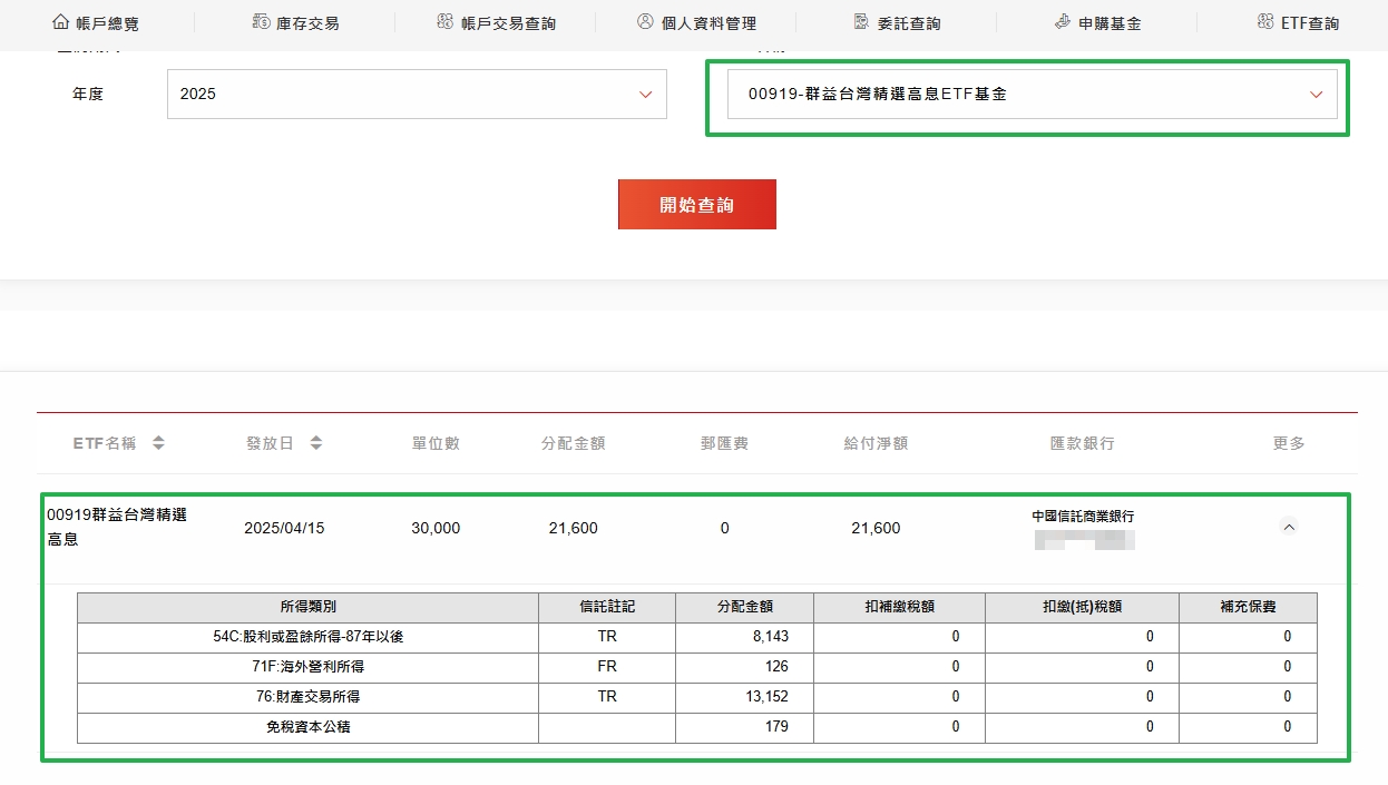 查詢配息資訊,可以查到"發放日"、"單位數"、"分配金額"、"匯款銀行"等資訊,點選最右邊"更多",展開下拉選單,可以看到本次配息的"所得類別"狀態,可以讓投資人更清楚配息的組成項目