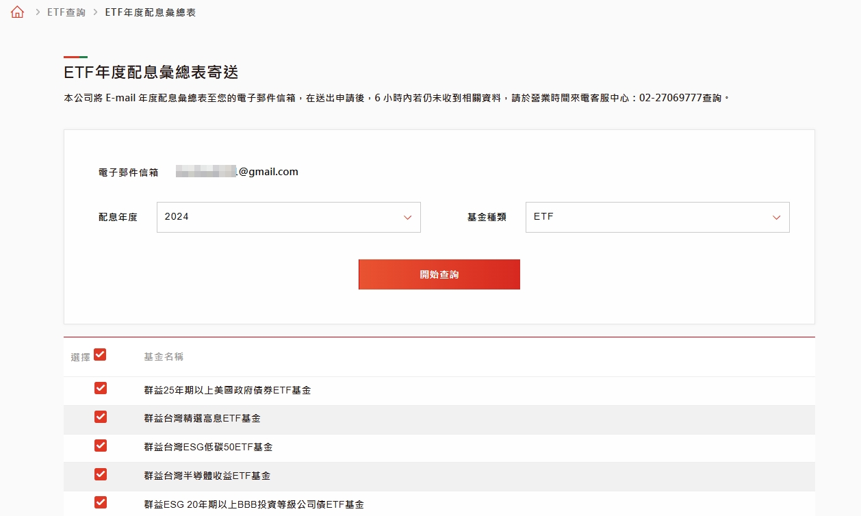 每新年度工作日第一天,即可查詢上一個年度的配息彙總表(年度彙總表一樣可選前3個年度),可以選擇全部也可選擇某幾檔,系統將轉成Pdf檔,透過e-mail寄送給您,便於審視年度配息,以利您規劃現金流的運用。