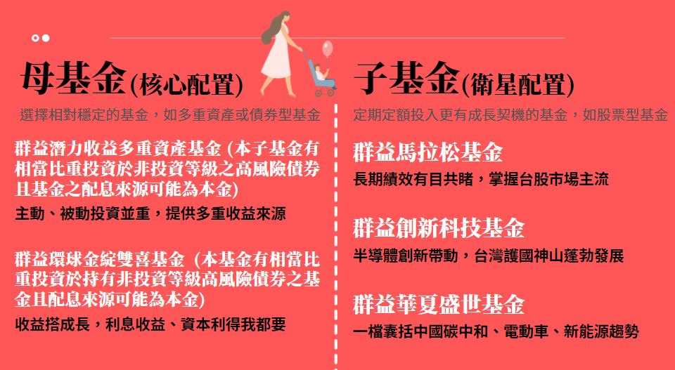 大筆資金很適合以『母子基金』配置。很多投資人一定聽過母子基金投資法,投入一筆錢買一個多重資產或固定收益型基金當作母基金,定期轉申購於投資波動較大的股票型基金也就是子基金,然後設定停利點,只要停利點到了,自動贖回子基金的金額回母基金。