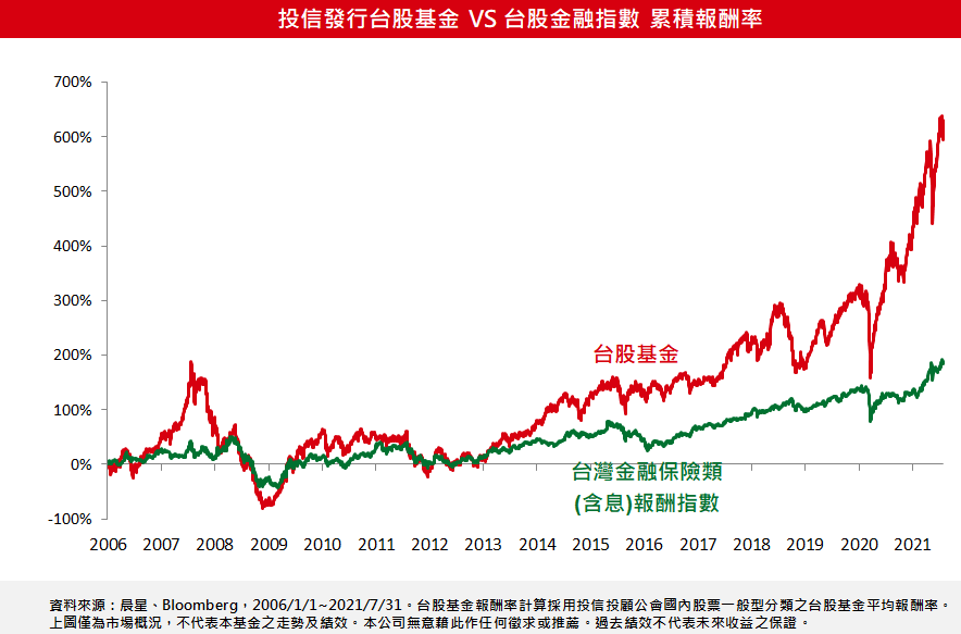 談到存股,很多人第一印象連結到金融股,股息殖利率高、股價波動小的特性受到存股族喜愛,不過觀察長期投資成效,由專業經理人操作的台股基金,擁有持股分散、可即時因應市況配置等優勢,在多數時間累積報酬率都贏過金融股,建議熱愛存股的投資人也可用基金存台股,長期投資更有效率。