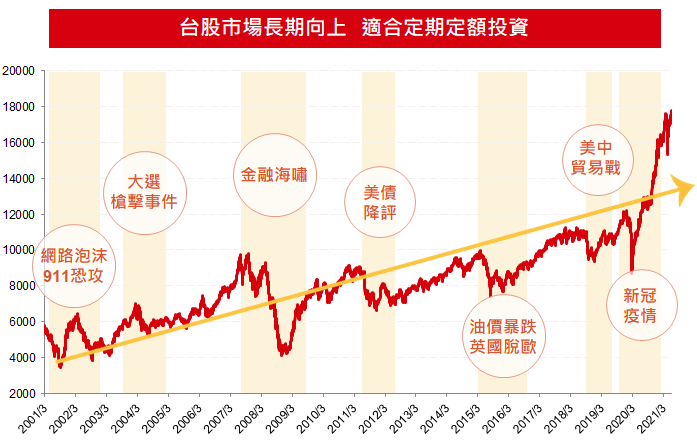 出乎意料的統計結果,「牛長熊短」的台股市場是背後主因,過去20年台股震盪後總能整理攻高,長期向上的市場基調儼然已是共識,此類型市場適合投資人定期定額操作,不用糾結買點,只要是好市場、好基金,震盪期間反而是您攤平成本的加碼時機。