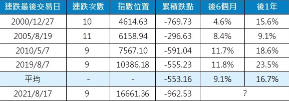 近期台股罕見連跌,加權指數落在半年線附近徘徊,引發不少市場擔憂,投資朋友請別慌張,根據統計2000年來,指數連9跌(含以上)只發生5次,本次下跌累積跌點對照過去經驗已趨於滿足,反倒創造中長期進場好時機。