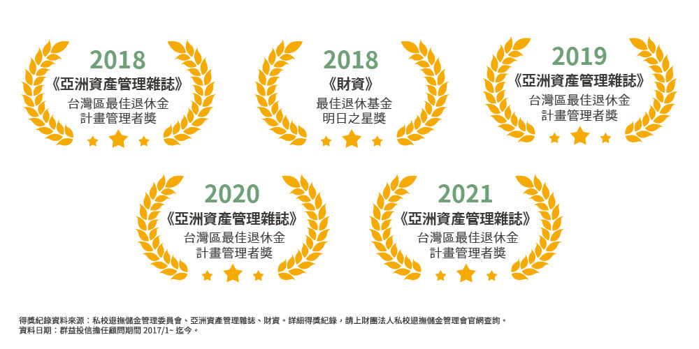 您聽過「私校退撫儲金」嗎?私校退撫儲金是國內第一個公辦民營的退休金制度,群益投信擔任全台唯一退休自主投資平台「私校退撫儲金帳戶」顧問,投資實力備受60,000名私校教職員與大獎肯定。現在,不只私校老師可擁有良好的退休資產配置,群益投信獲獎團隊100%複製「私校退撫儲金」策略,打造群益全民退休組合傘型基金,讓您同樣享有顧問級的退休資產配置。按照操作風格分成保守配置、穩健配置、積極配置三種,您可依風險承受度及年紀來選擇對應產品,作為退休理財規劃核心投資工具。