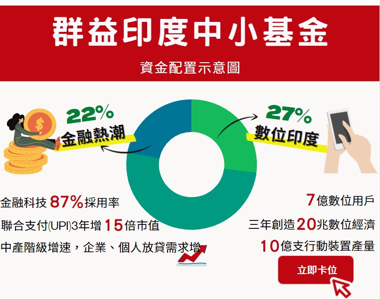 印度蓬勃發展之際,中產階級人數大幅攀升,企業、個人放款勢必速增,加上近年金融科技如火如荼發展,印度的金融科技採用率高達87%,為全球最高,金融區塊無疑是後續支撐市場的中流砥柱。有別一般印度基金側重於金融產業,「群益印度中小基金」均衡配置科技、金融雙明星產業,不僅帶來亮眼報酬,更鎖定未來內需爆發行情。
