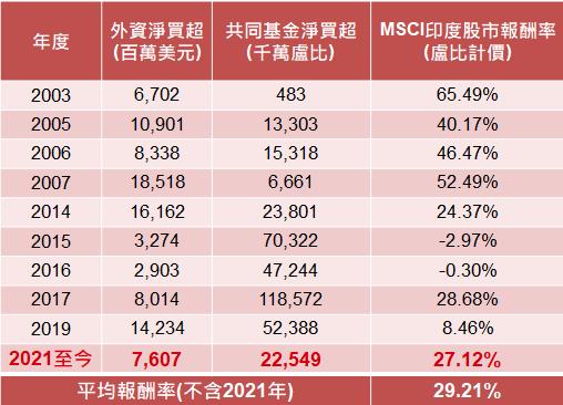 印度股市不僅是外資寵兒,內資也搶搭印度經濟特快車,今年皆買超逾6000萬美元,顯示海內外同步看好印度未來的決心。求證過往數據,內外資同時買超的年度,印度股市的平均表現約上漲29%,跟著聰明資金進駐印度股市,提早卡位印度經濟。