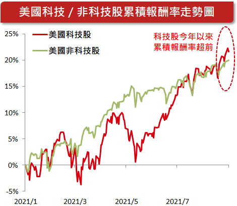資料來源: Bloomberg、群益投信整理,2021/1/1~2021/8/31,累積報酬率採S&P 500科技及非科技指數計算。上圖僅為市場概況,不代表本基金之走勢及績效。本公司無意藉此作任何徵求或推薦。過去績效不代表未來收益之保證。