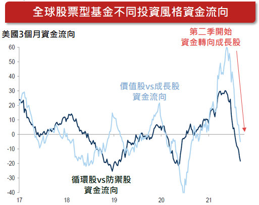 上半年強勁通膨行情,帶動價值股漲勢,但隨時序來到2021尾聲,從指標性市場-美國的資金流向觀察可知,科技族群為首的成長股將重返主流地位,扮演後續領漲市場的角色︰