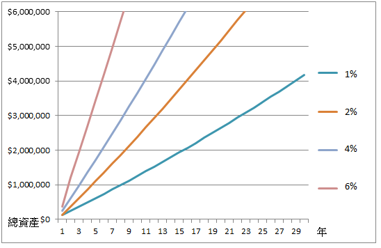 假設每年年初都投入240,000,不同年報酬,結果差異很大