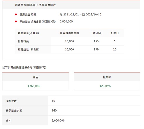 群益投信整理,資料日期:2011/11/01~2021/10/30,圖示:群益母子基金投資,假設2011年11月1日首次申購母基金2,000,000元,每月5日固定從母基金轉申購至群益創新科技基金20,000元,每月10日固定從母基金轉申購至群益華夏盛世基金20,000元以上僅為歷史資料模擬投資組合之結果,不代表本投資組合之實際報酬率及未來績效保證,不同時間進行模擬操作,其結果亦可能不同。本公司所作任何投資意見與市場分析資料,係依據資料製作當時情況進行分析判斷,本公司已力求資訊之正確與完整,惟文中之數據、預測或意見恐有疏漏或錯誤之處,或因市場環境變化而變更,投資標的價格與收益亦將隨時變動,恕不保證其完整性。