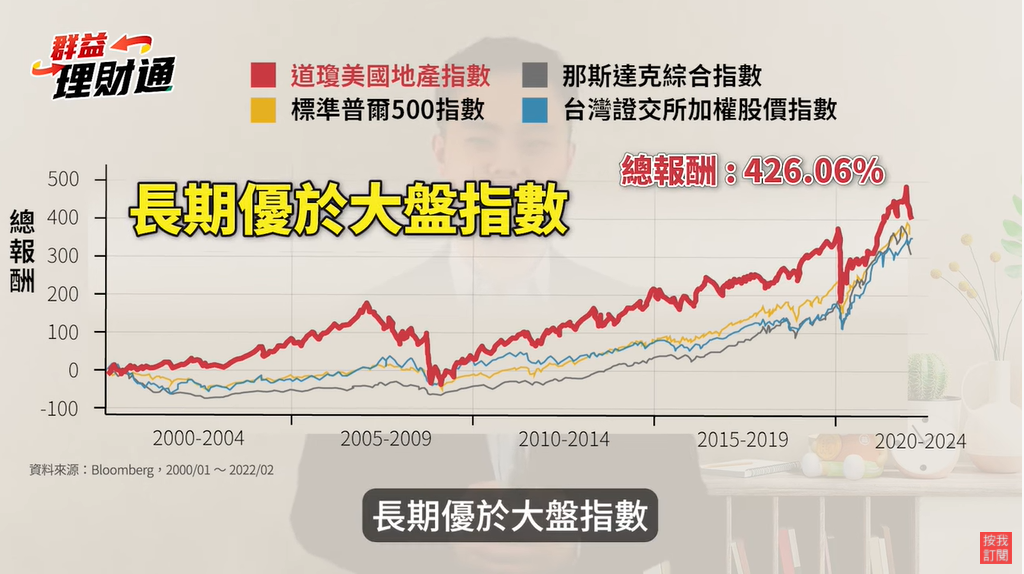 道瓊美國地產指數是目前美國最具代表性的REITs指數,比傳統型REITs更多元,也涵蓋了跟科技趨勢的REITs,其中包含美國最大的5G電塔出租公司、全世界最大的電商物流房地產公司、美國最大的雲端資訊中心等,也因為緊跟科技大趨勢,加上房地產易漲難跌,道瓊美國地產指數從2000年以來,長期優於大盤指數,例如那斯達克,S&P500,甚至是台灣加權指數。