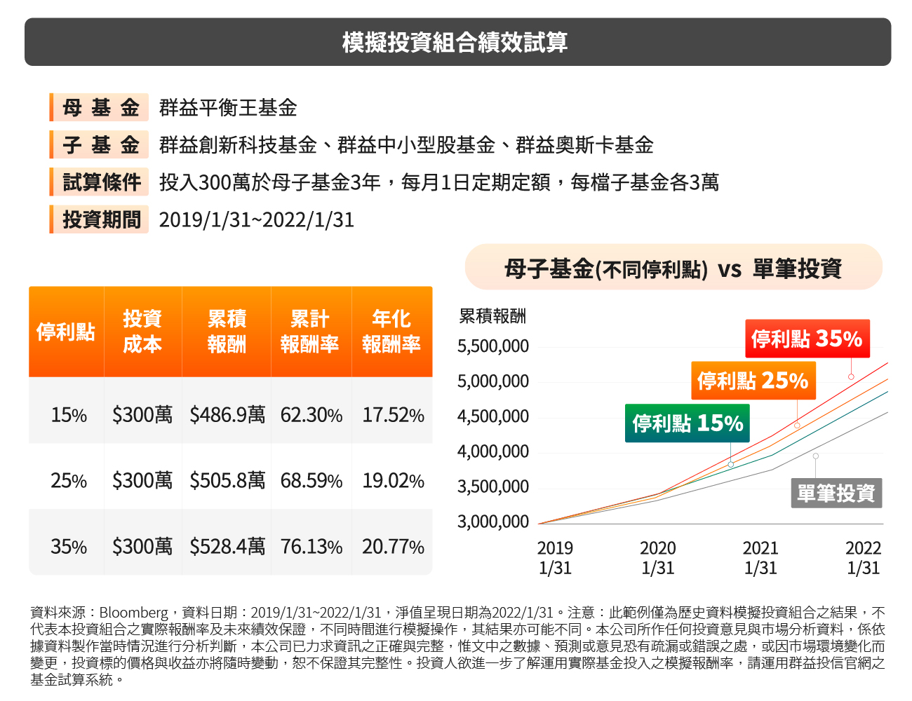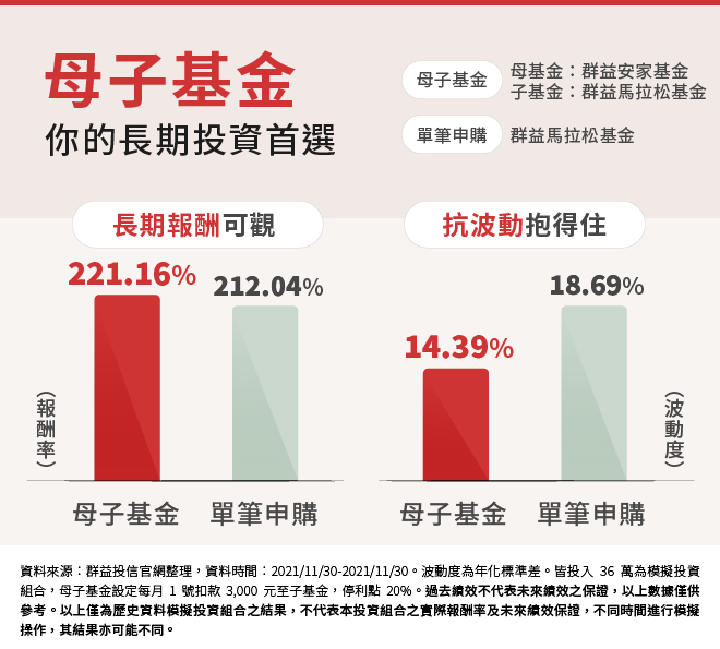 但差別在於用「母子基金投資」具備更強的抗波動表現,控制資金震盪的能力更勝於「單筆申購」,優化程度達二至三成,完美詮釋其「穩中求勝」的投資價值。