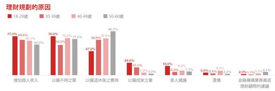 關鍵議題研究中心(TNLResearch),2020年針對18至29歲青年族群進行調查,6-7成的台灣民眾有理財規劃的習慣,即便是最沒有理財習慣的18至29歲青年族群,也有超過半數的人會規劃個人財務,其中青年族群理財最主要的動機,就是要「增加個人收入」,占比達77%。