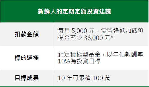 相對於股票的投資難度,基金是新手容易入手的工具,不需發費時間研究與選股,可更輕鬆的進行投資。25-35歲左右的年輕人才剛出社會,薪資普遍不高、閒置資金也較少,但可善用「時間」這個巨大優勢。事實上,25-35歲是投資的黃金期,如果能紀律付諸行動,例如選擇定期定額基金,類似過去零期整付的儲蓄方式,投資三到五年(歷經一個完整的景氣循環),有了成功的投資經驗,就能更長期投資,讓人生第一桶金輕鬆達陣。