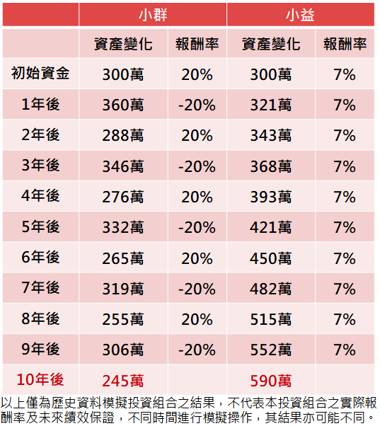 廝殺股海的小群,花了大把時間研究市場,鑽研技術面、籌碼面,但過大的風險導致不穩定的績效,最終反而還讓他賠了錢;反觀小益只是簡單把錢放在穩定的投資組合,10年後就已多累積一筆可觀的資金。