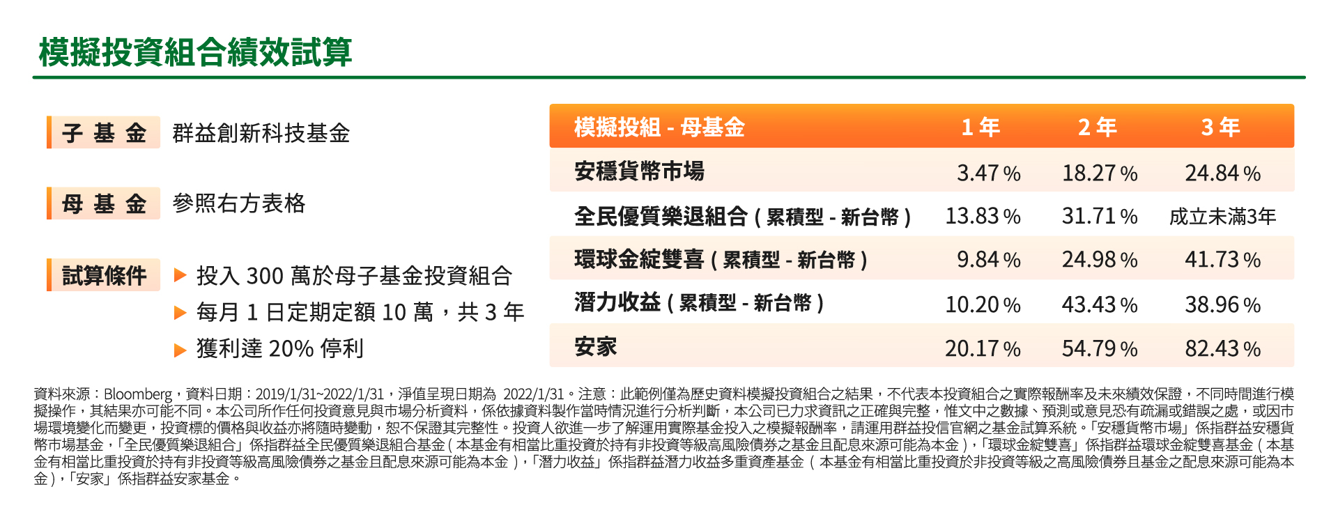 若你很看好台股科技前景,可以用群益創新科技基金當作子基金,針對過去三年回測數據,只要你採取「母子基金投資法」,依照個人風險偏好,搭配不同類別的穩健母基金,都能有令人滿意的回報。
