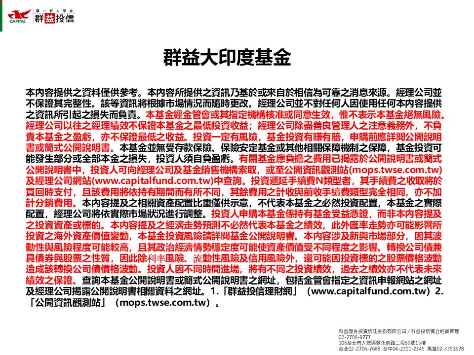 本基金將掌握印度經濟發展所帶來得資本市場成長契機,投資主軸包括受惠政府改革政策的相關題材產業,及人均所得提高下所創造出的龐大內需消費相關產業,並追求中長期穩健成長的投資績效。